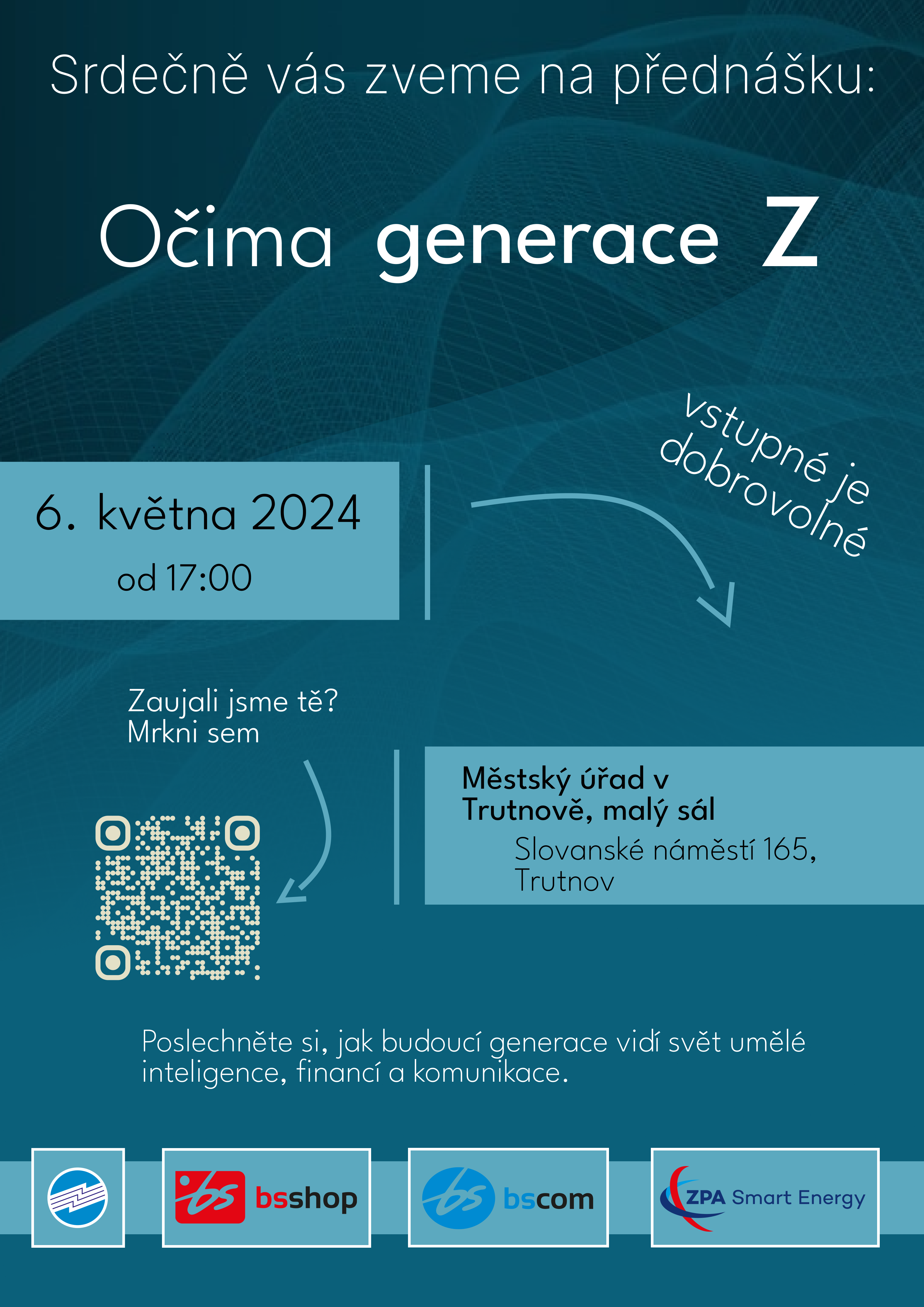 Přinášíme Vám pozvánku na velmi zajímavou přednášku „Očima generace Z“, která se uskuteční dne 6.5. od 17 hodin na Městském úřadu v Trutnově (malý sál) a pořádá ji „Podnikatelský kroužek“ žáků při Střední průmyslové škole, Trutnov.  Přednáška se bude zaměřovat především na to, jak budoucí generace vidí svět umělé inteligence, financí a komunikace.