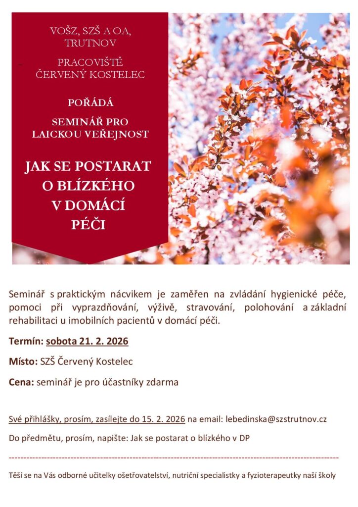 Seminář zaměřený na praktický nácvik péče o imobilní osoby v domácím prostředí nabídne účastníkům základní dovednosti v oblasti hygienické péče, výživy, polohování i rehabilitace. Akce je určena laické veřejnosti, proběhne 21. února 2026 v SZŠ Červený Kostelec a je zdarma.
