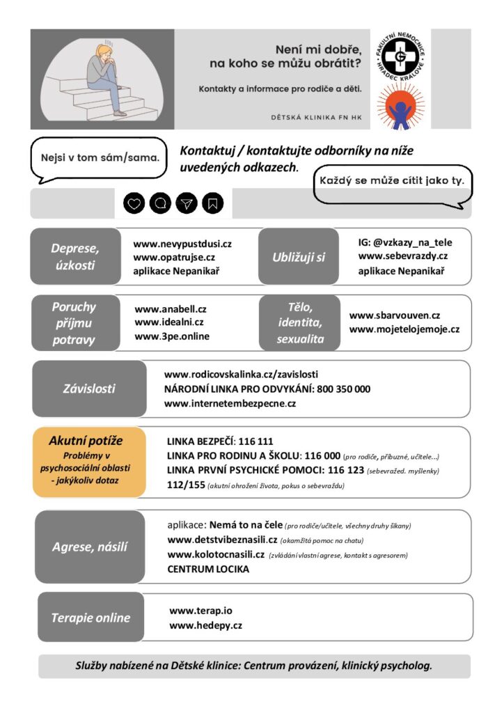 Podzimní měsíce často přinášejí únavu, smutek a větší psychickou zátěž. Přinášíme proto infografiku od Dětské kliniky FN HK, kterou mohou školy využít k podpoře žáků — obsahuje přehled kontaktů na odbornou pomoc, tipy na péči o duševní zdraví a doporučení, jak v náročném období nezůstávat na potíže sami.