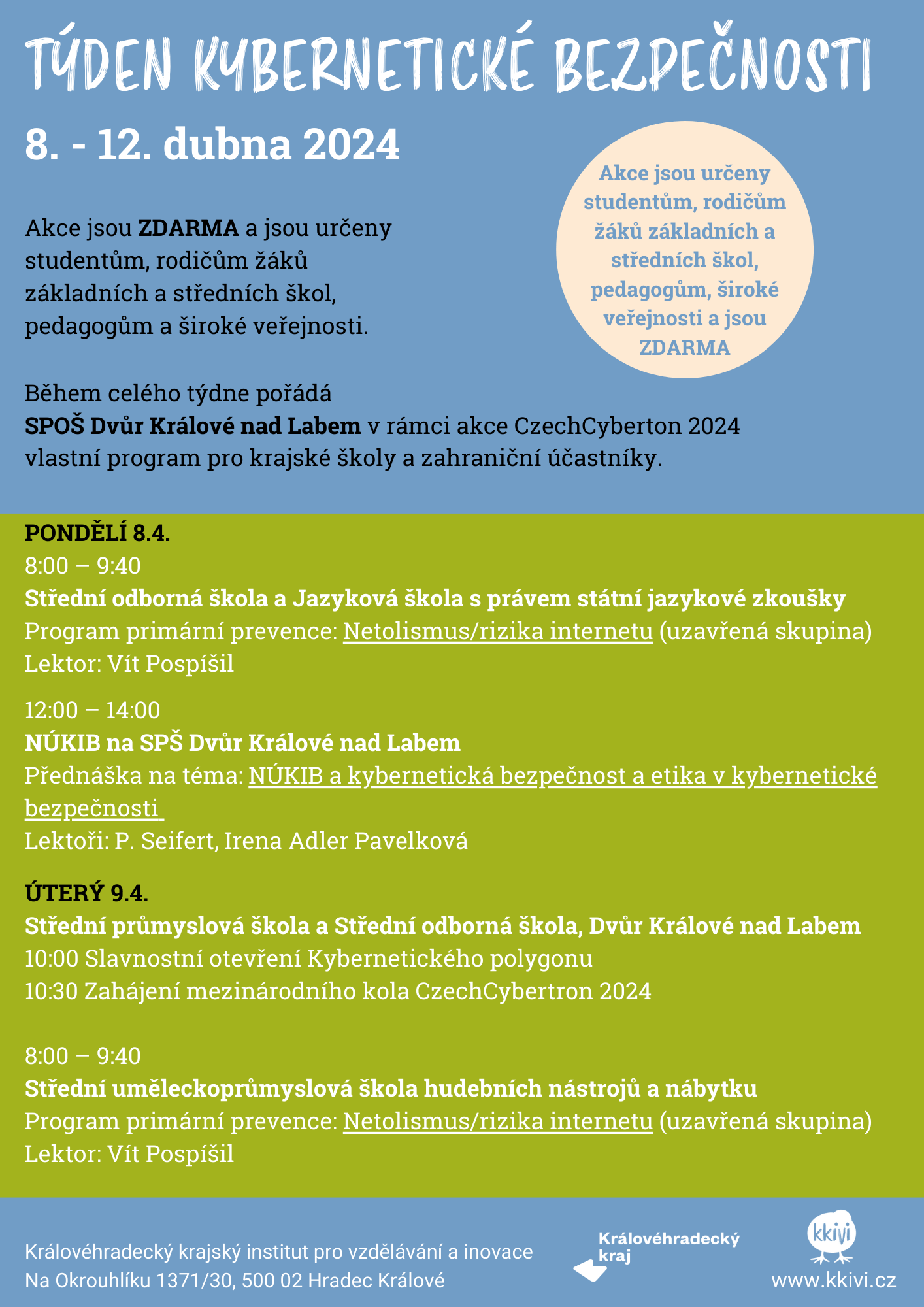 Cílem akce je podpořit bezpečnost dětí, studentů, pedagogů, ale i rodičů a široké veřejnosti v online prostředí.Hlavními tématy pak jsou rizikové jevy spojené s online prostředím, především pak kybernetické formy agrese a kyberšikana, online závislosti (netolismus),  zneužití osobních údajů v prostředí elektronických médií, rizika spojená s online seznamováním a fenomén kybergrooming, sexting a jeho rizika, aktuální trendy v oblasti rizikového chování. Na Střední průmyslové škole ve Dvoře Králové nad Labem proběhne od 8. do 11.4. 2024 další ročník CZECH CYBERTRON. Zahájení mezinárodního kola proběhne za účasti zahraničních hostů z Polska, Slovenska, Rakouska a Itálie a uskuteční se ve dnech 9. do 10. dubna 2024. Záštitu nad akcí CZECH CYBETRON převzali hejtman a náměstek hejtmana Královéhradeckého kraje, NÚKIB, včetně zástupců vybraných ministerstev a Parlamentu ČR. Opět budou soutěžit týmy složené ze zástupců středních škol a nový scénář letošního ročníku vychází z reálných kybernetických útoků, které se staly v posledních letech. Součástí budou doprovodné akce, přednáška zástupců společnosti NÚKIB a další. Významnou událostí tohoto týdne pak bude  Slavnostní otevření Kybernetického polygonu (laboratoře pro řešení kybernetických incidentů), které se uskuteční v úterý 9.4. v 10 h za účasti vedení Královéhradeckého kraje.