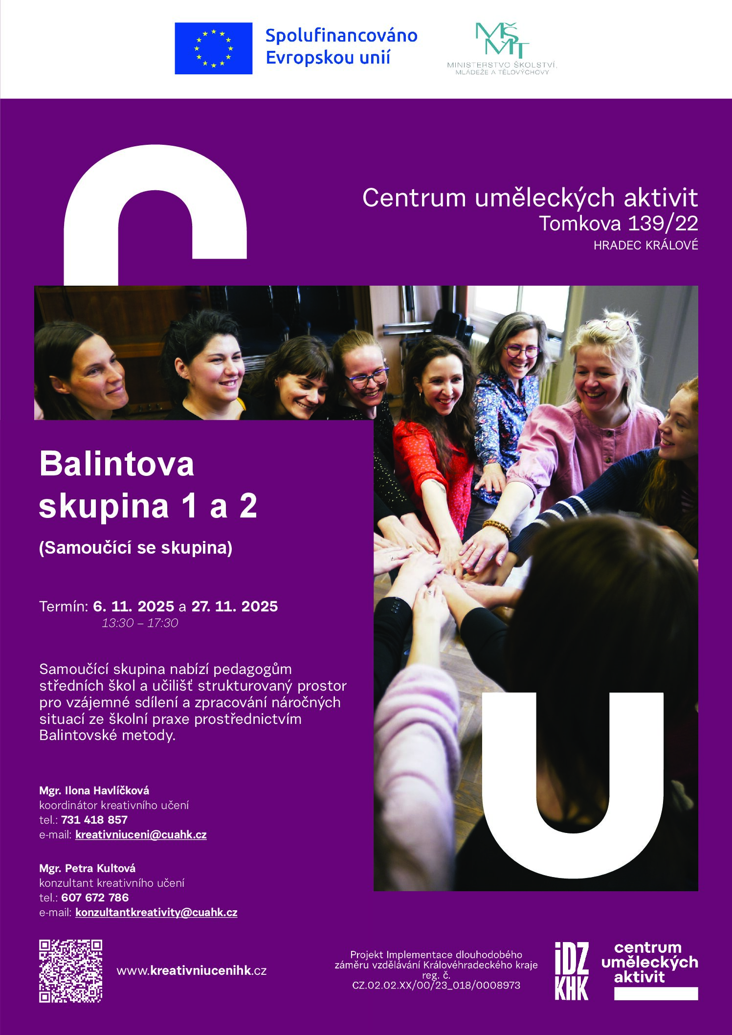 Samoučící skupina nabízí pedagogům středních škol a učilišť strukturovaný prostor pro vzájemné sdílení a zpracování náročných situací ze školní praxe prostřednictvím Balintovské metody. Během čtyřhodinového setkání si účastníci ve skupině maximálně 12 osob mohou podělit o své konkrétní případy a výzvy z učitelské praxe, přičemž každý má možnost přinést specifickou situaci ze své třídy a získat na ni zpětnou vazbu, nové náhledy na možná řešení a pochopení od kolegů. Balintovská metoda umožňuje strukturované sdílení situací a společnou reflexi, která posiluje profesionální kompetence, snižuje riziko vyhoření a rozvíjí schopnost lépe porozumět studentům a pedagogickým vztahům. Skupina vytváří příležitost pro profesní rozvoj prostřednictvím vzájemného učení a podpory mezi kolegy.