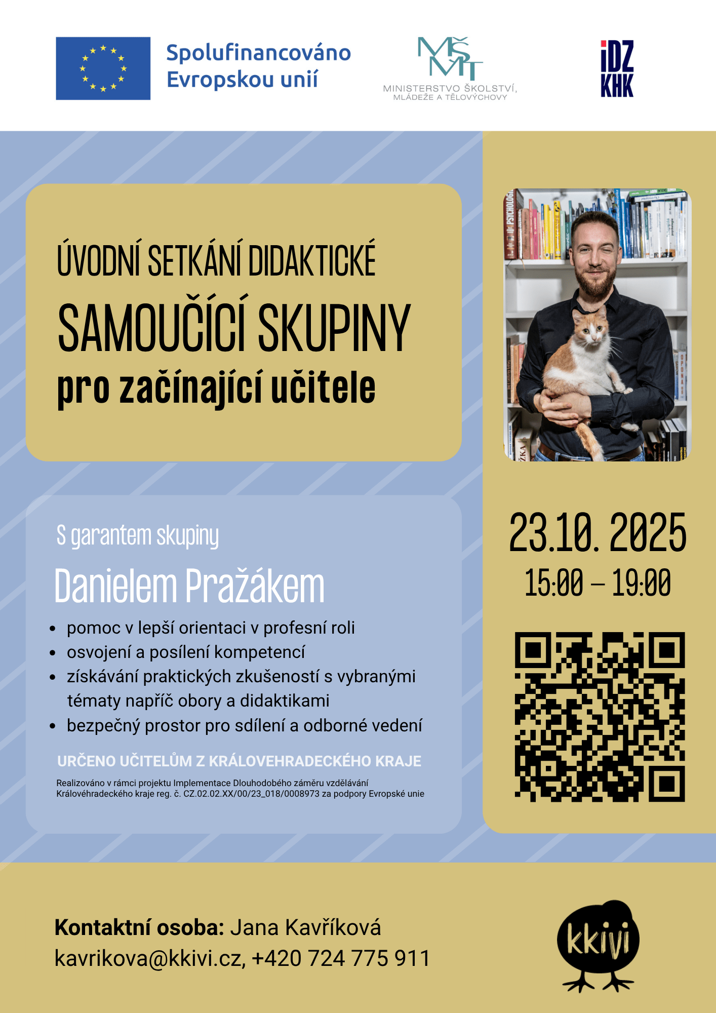 Role garanta samoučící skupiny se ujal Daniel Pražák a vy se na něj můžete těšit hned na tomto úvodním setkání, které se bude věnovat tématům začátku školního roku, sdílení prvotních zkušeností a zejména nastavení sebepodpory a wellbeingu společně s technikami zvládání stresu.