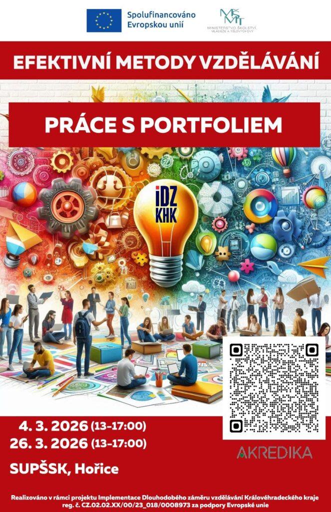 Srdečně vás zveme na vzdělávací kurz zaměřený na Efektivní metody vzdělávání –  Práce s portfoliem. Záměrem je podpořit pedagogické pracovníky přímo působící v procesu vzdělávání, kteří mají odborné znalosti z oblasti pedagogiky, psychologie a didaktiky a mohli tak kvalifikovaně a efektivně propojit své dosavadní teoretické znalosti a praktické dovednosti a rozšířit své pedagogické kompetence. Během kurzů získají i tipy na řadu nástrojů a technik využitelných v praxi. Důraz bude kladen na aktuální problémy a trendy v oblasti efektivních a inovativních metod vzdělávání.
