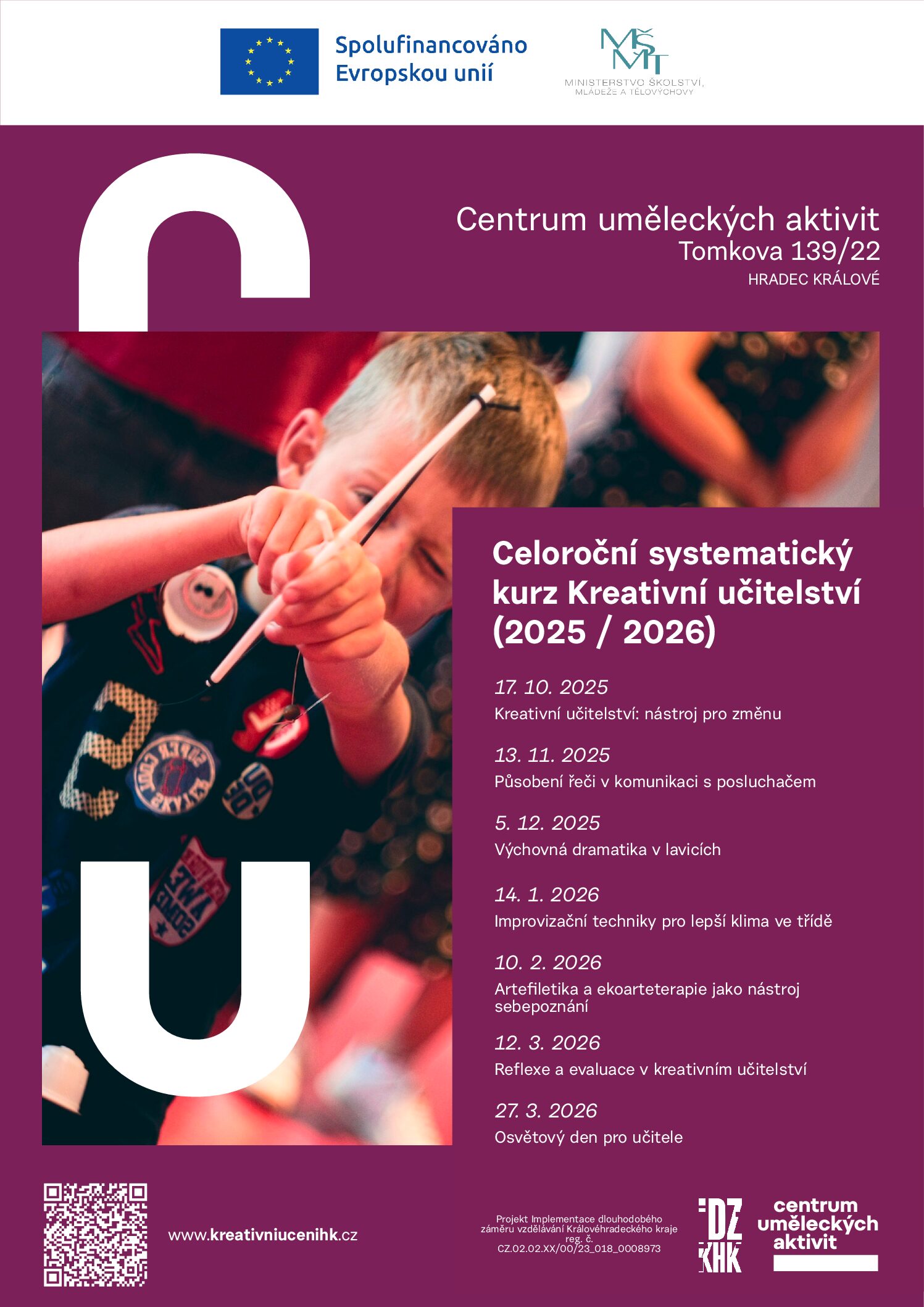 Vše, co jsme za rok načerpali – kreativní učitelství, stavění reflexe, dramatickou výchovu, improvizaci, artefiletiku – budeme moci využít pro vystavění unikátních aktivit zaměřených pro svou praxi. Skrze praktické ukázky, diskuze a společné zastavení nad uplynulým kurzem se zaměříme na to, jak kreativní metody proměnily náš přístup, atmosféru i zapojení studentů.