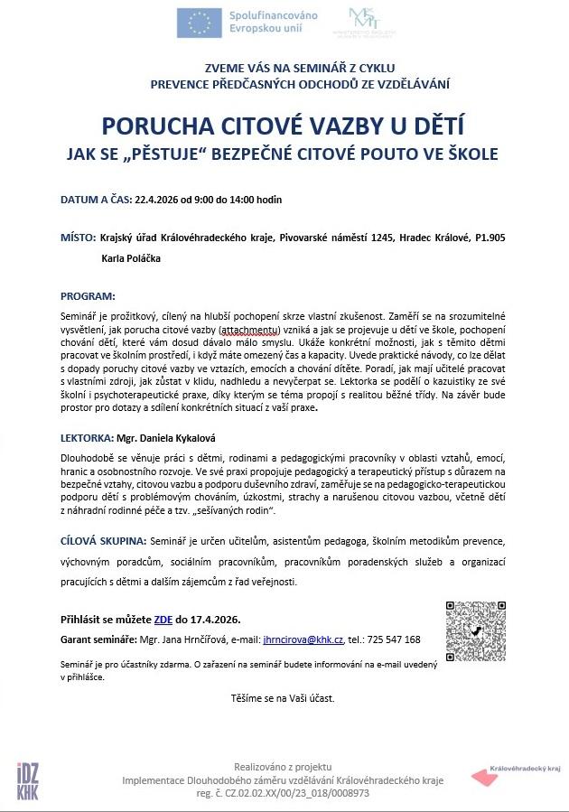 Seminář je prožitkový, cílený na hlubší pochopení skrze vlastní zkušenost. Zaměří se na srozumitelné vysvětlení, jak porucha citové vazby (attachmentu) vzniká a jak se projevuje u dětí ve škole, pochopení chování dětí, které vám dosud dávalo málo smyslu. Ukáže konkrétní možnosti, jak s těmito dětmi pracovat ve školním prostředí, i když máte omezený čas a kapacity. Uvede praktické návody, co lze dělat s dopady poruchy citové vazby ve vztazích, emocích a chování dítěte. Poradí, jak mají učitelé pracovat s vlastními zdroji, jak zůstat v klidu, nadhledu a nevyčerpat se. Lektorka se podělí o kazuistiky ze své školní i psychoterapeutické praxe, díky kterým se téma propojí s realitou běžné třídy. Na závěr bude prostor pro dotazy a sdílení konkrétních situací z vaší praxe.