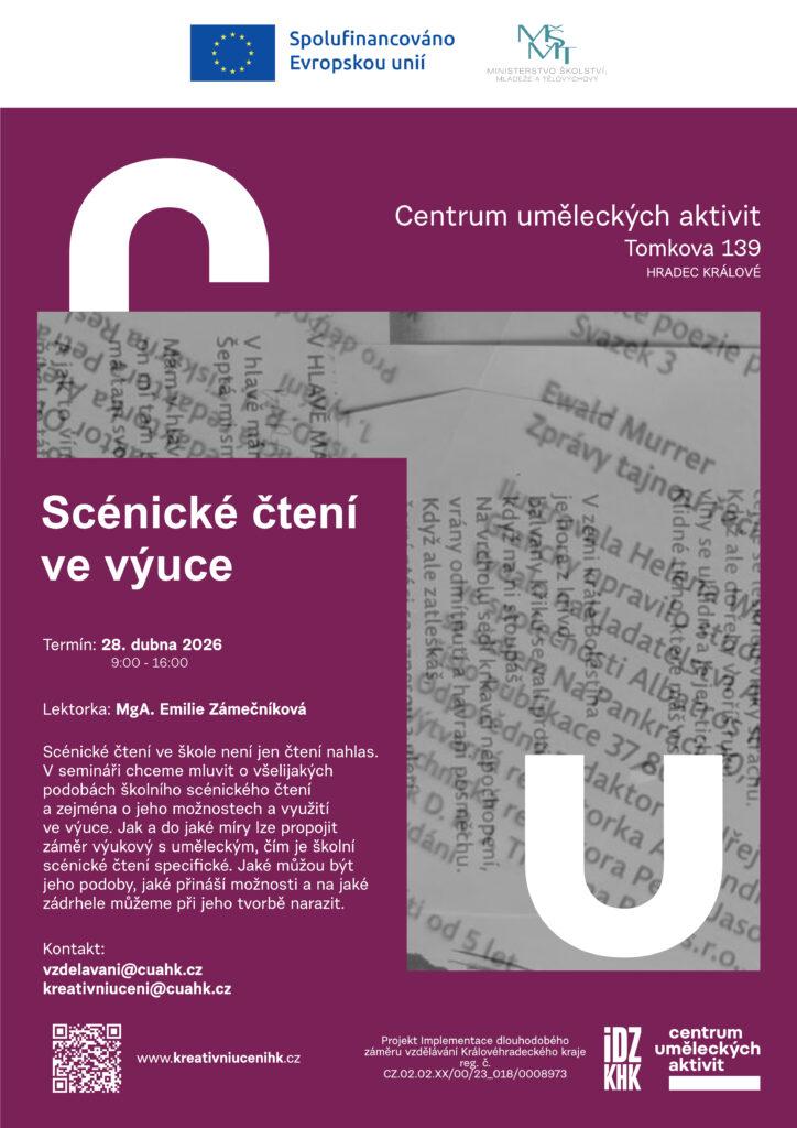 Scénické čtení ve škole není jen čtení nahlas. V semináři chceme mluvit o všelijakých podobách školního scénického čtení a zejména o jeho možnostech a využití ve výuce. Jak a do jaké míry lze propojit záměr výukový s uměleckým, čím je školní scénické čtení specifické. Jaké můžou být jeho podoby, jaké přináší možnosti a na jaké zádrhele můžeme při jeho tvorbě narazit.