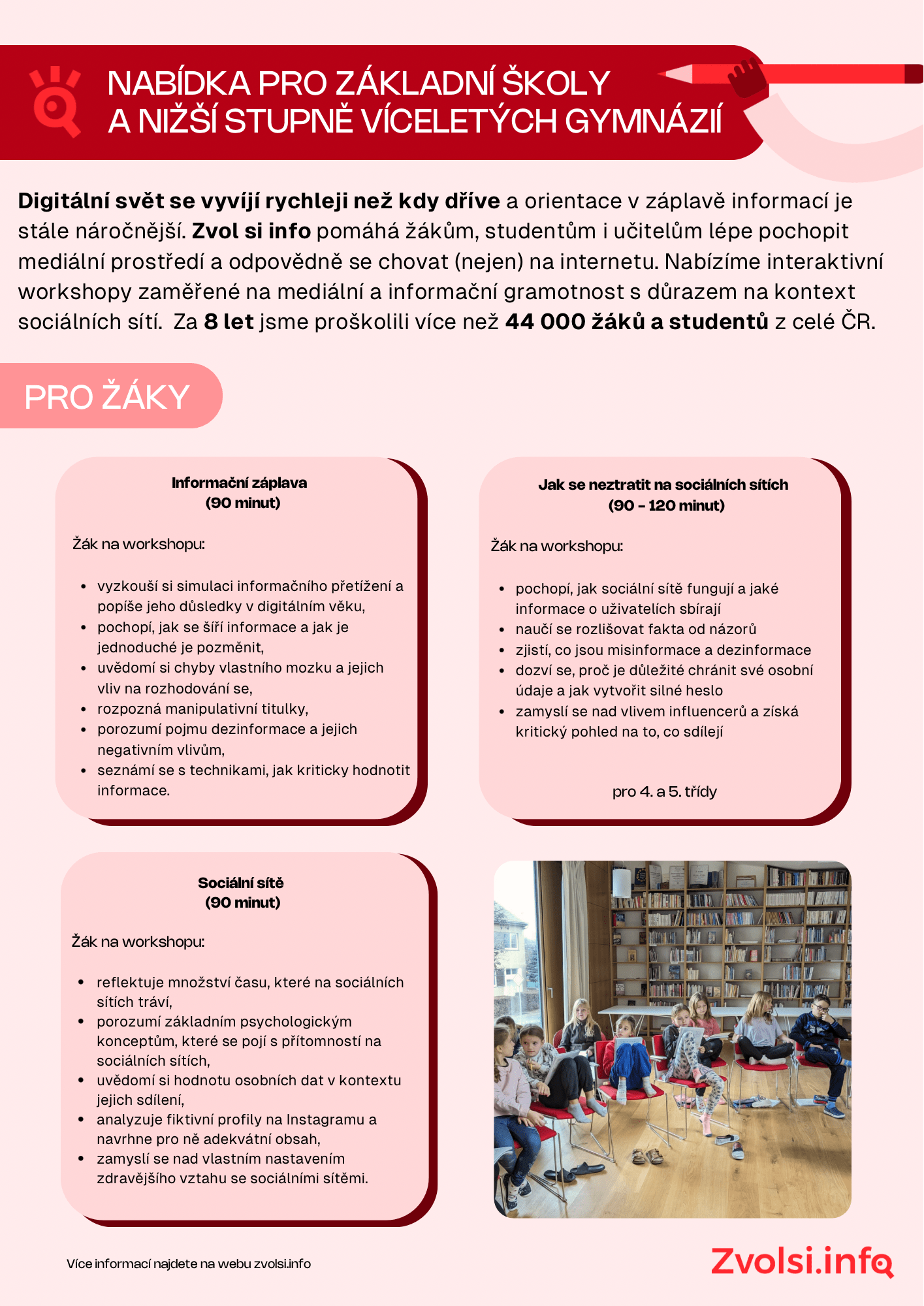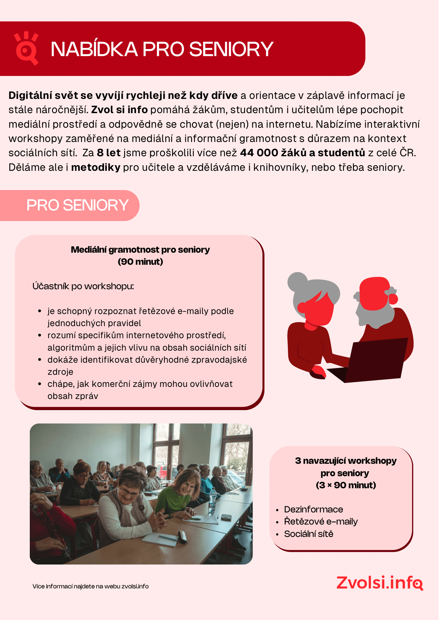 Víte, co má společného fake news, deepfake a phishing? To vše (a mnohem víc) učí žáky, studenty, pedagogy i seniory v rámci svých workshopů o informační a mediální gramotnosti Zvolsi.info. Tato vzdělávací organizace nabízí workshopy pro pedagogy na míru – nejen o tom, jak učit studenty kriticky pracovat s informacemi, ale také o tom, jak mohou samotní pedagogové využívat nové technologie v přípravě a v samotném procesu vzdělávání. Dále také interaktivní programy pro žáky a studenty ZŠ a SŠ plné praktických ukázek a her a v neposlední řadě i kurzy pro seniory, kterým pomáhají orientovat se v online světě. Kurzy do tříd i pro veřejnost je možné realizovat ZDARMA. Podívejte se na více info ZDE.